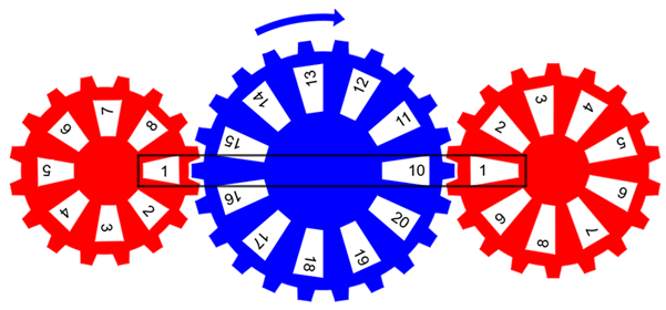 As the cogs rotate, with the central cog always going clockwise, Ada adds together all 792 different 4-digit numbers she sees in the rectangle, starting with 1101 as shown. Her sum is \(S\).